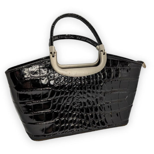 Vintage Black Leather Crocodile Structured Clutch Tote Handbag Women One Size