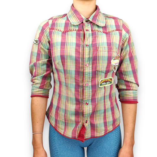 Next Petite Vintage Green Pink 3/4 Sleeve Plaid Shirt Blouse Women Size UK 10