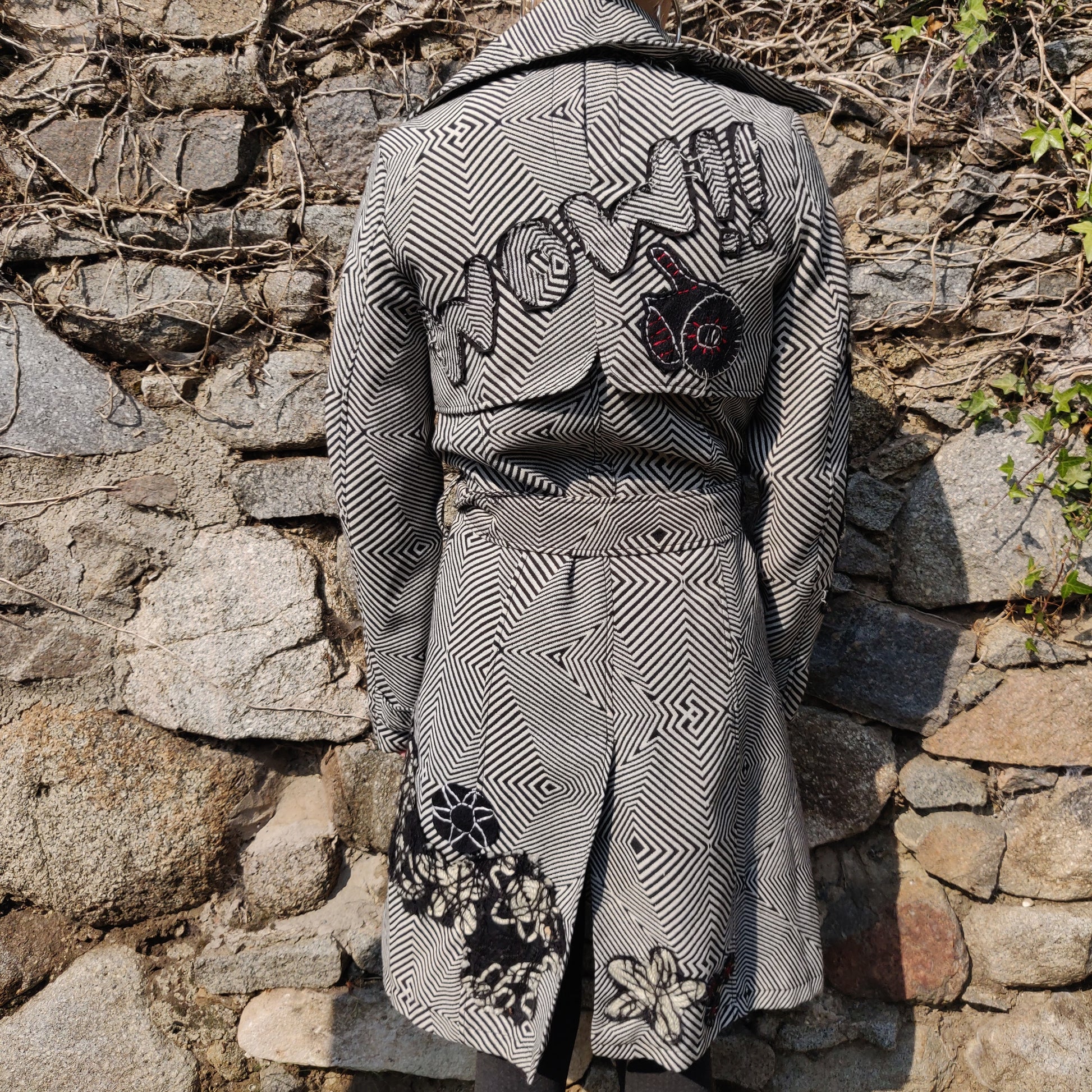 Desigual Grey Black White Striped Trench Coat Jacket Women Size Small EU 40