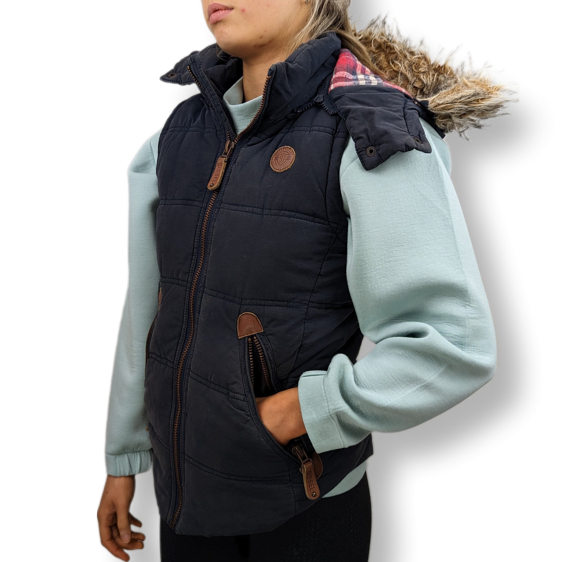 Diesel Vintage Navy Puffer Gilet Faux Fur Hood Women Size Small