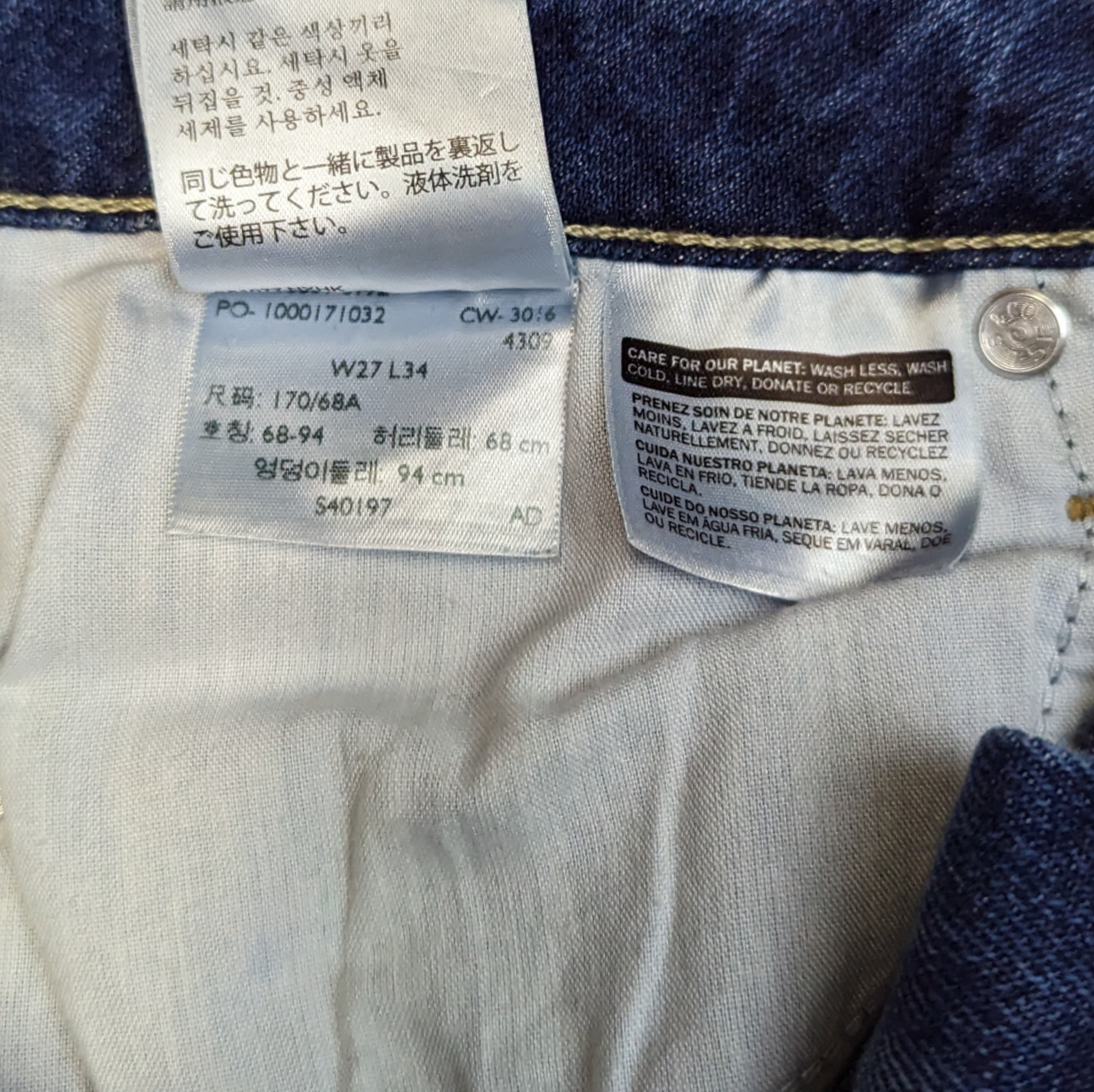 Measurements on tag are W27/L34 but it looks like it's been stretched out to 30" waist and inseam length is now 31"
