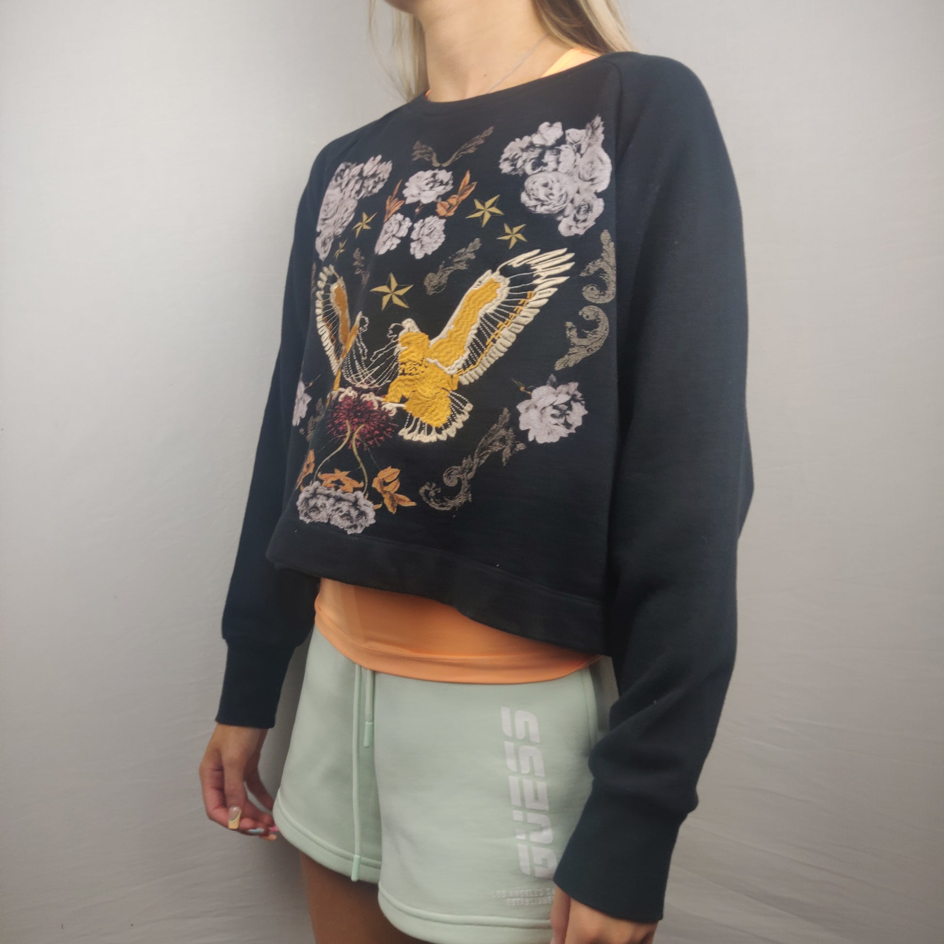 Zara Trafaluc Black Floral Cropped Sweatshirt Embroidered Women Size Medium